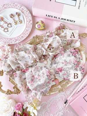 上品なふんわりとした花柄リボンに、アンティーク調のフラワーをランダムに閉じ込めたハートをセンターにあしらい、ガーリーな中にも洗練された雰囲気をプラスしました。