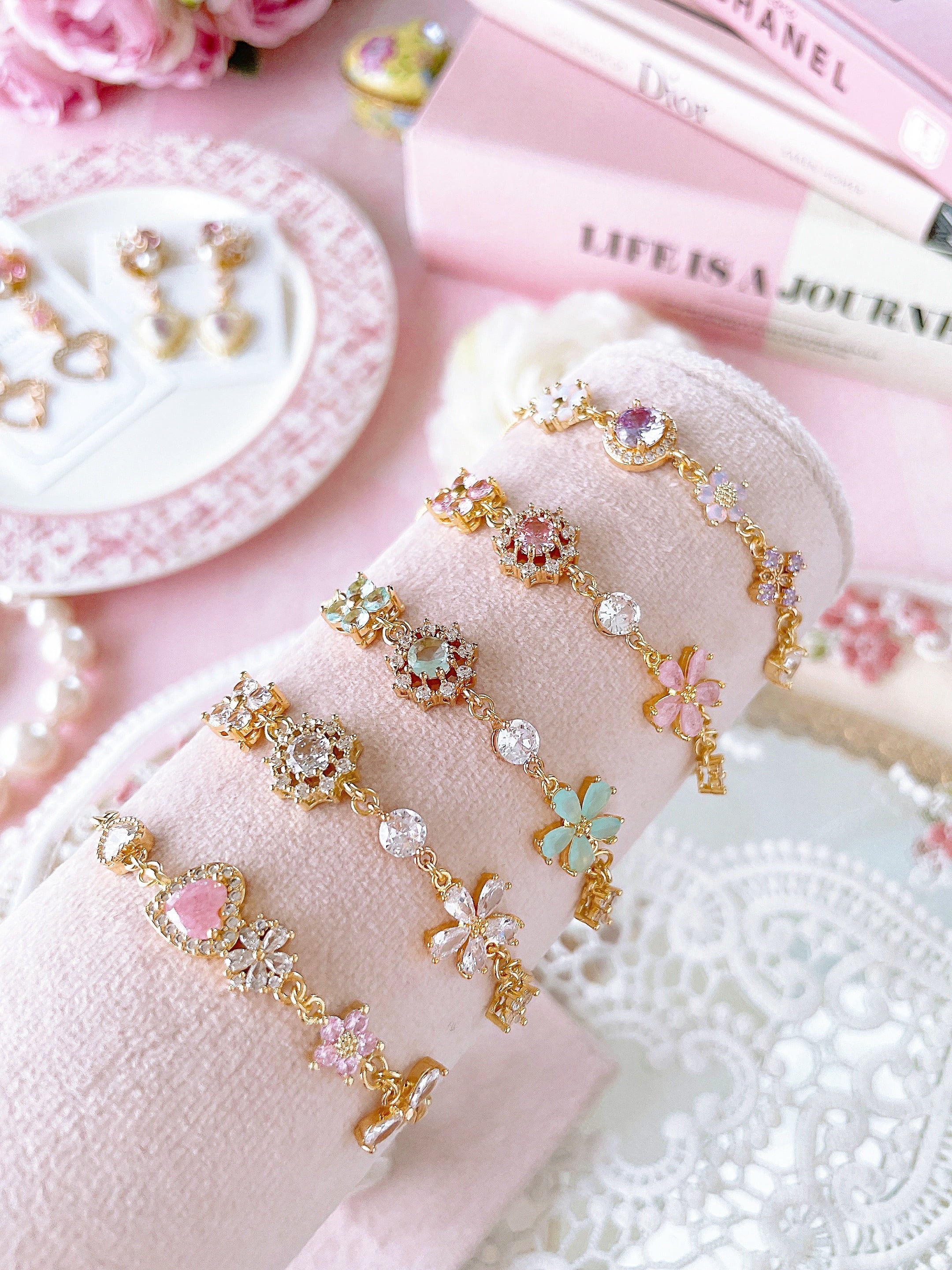 お花モチーフなどのジルコニアの繊細なきらめきをまとい、そっと手元に華やぎを添えるブレスレット。