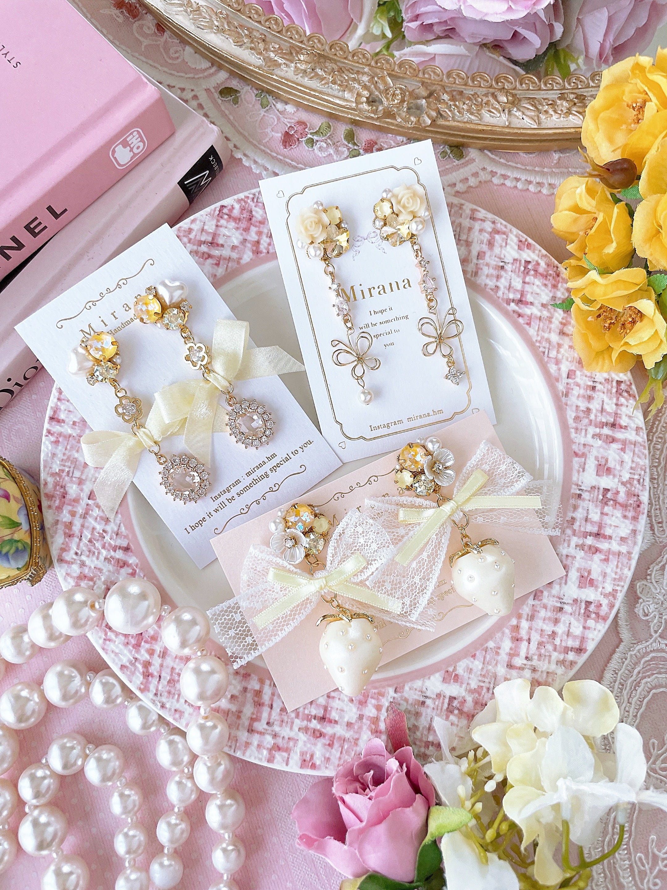 揺れるたびにふわりと舞う蝶々や、そっと咲いたバラと煌めくレアカラーのビジューを使用したピアス/イヤリング。