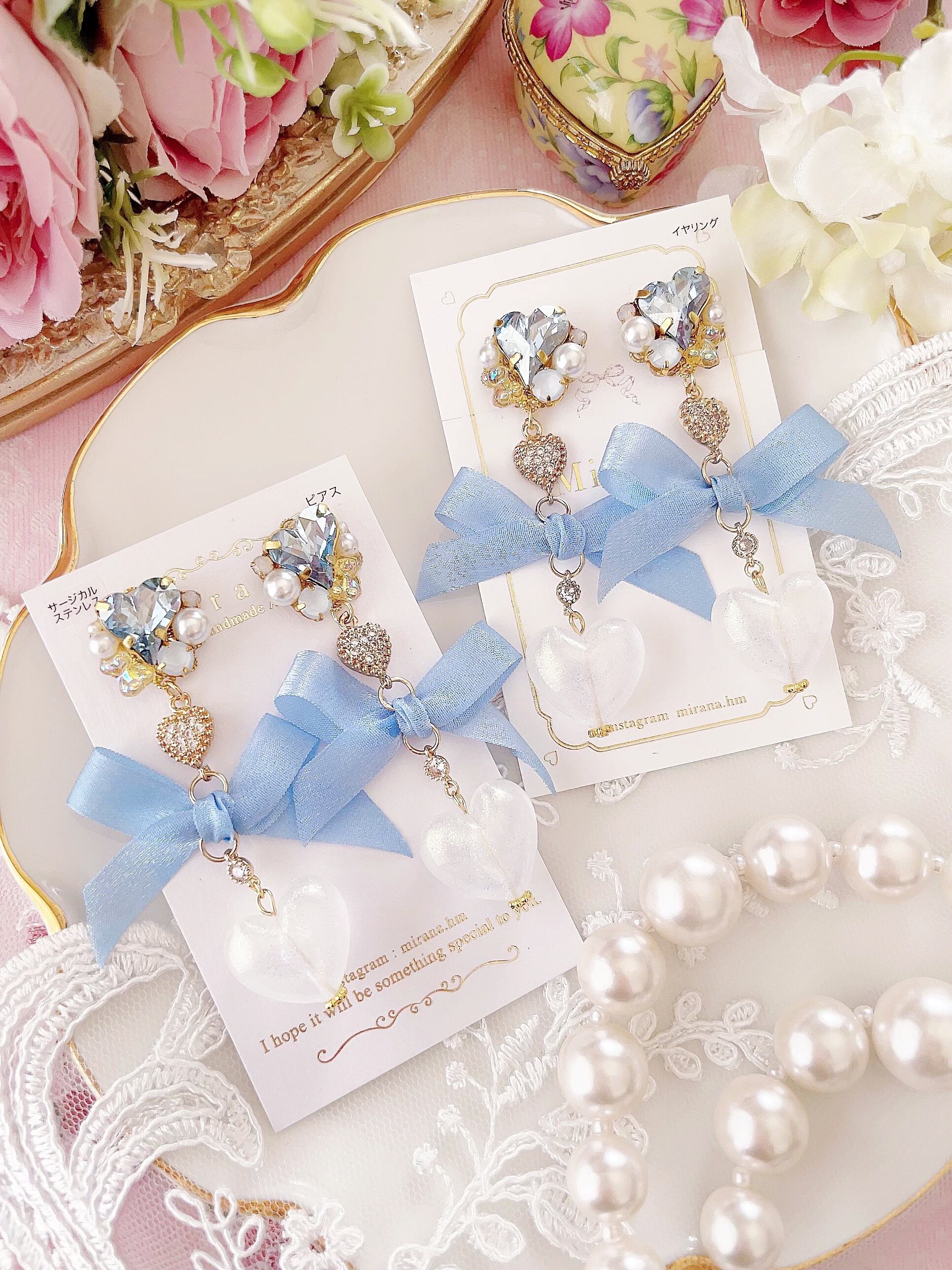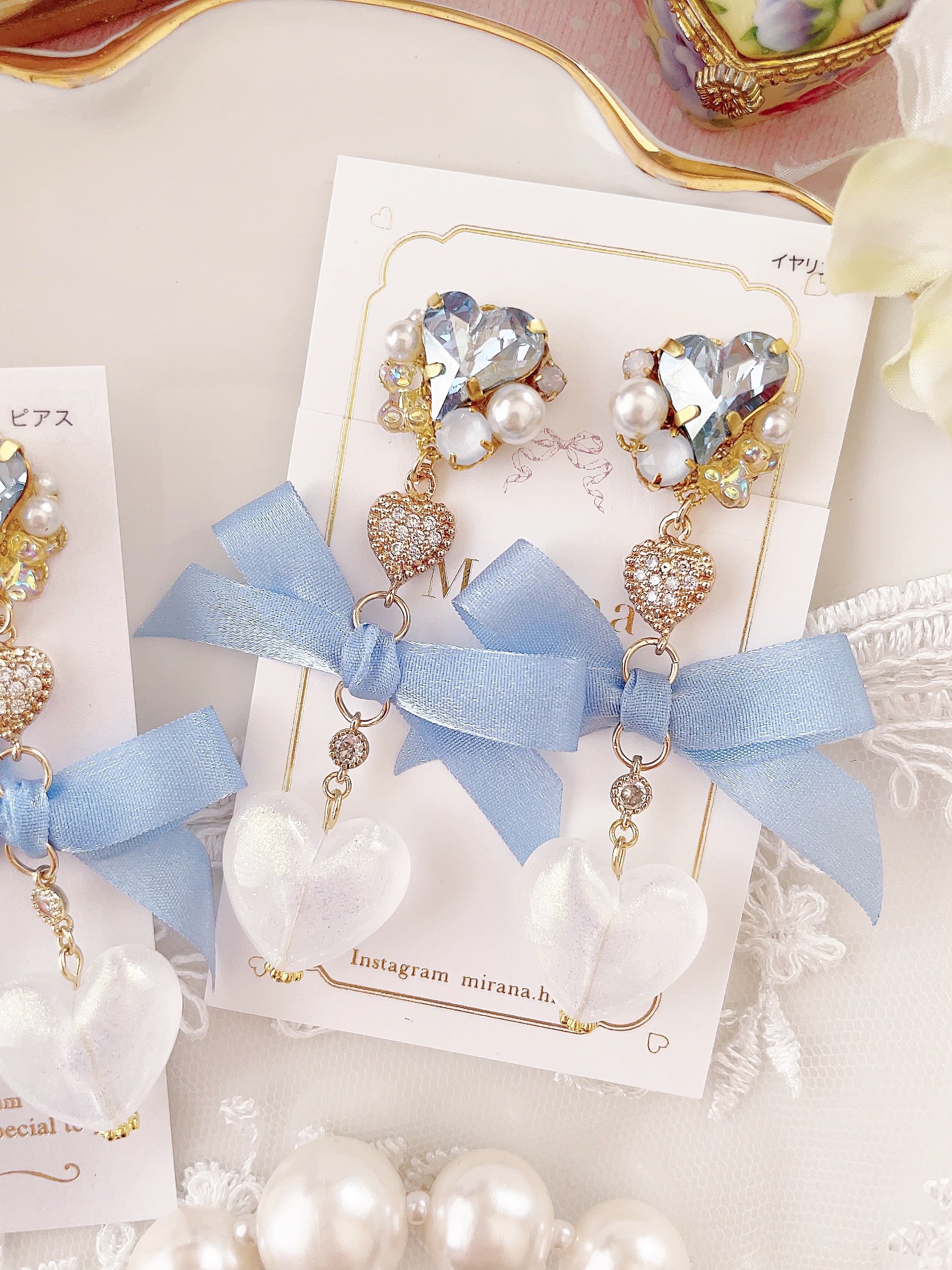 目を惹く鮮やかなブルーのリボンがポイントのガーリーで爽やかなピアス/イヤリング。