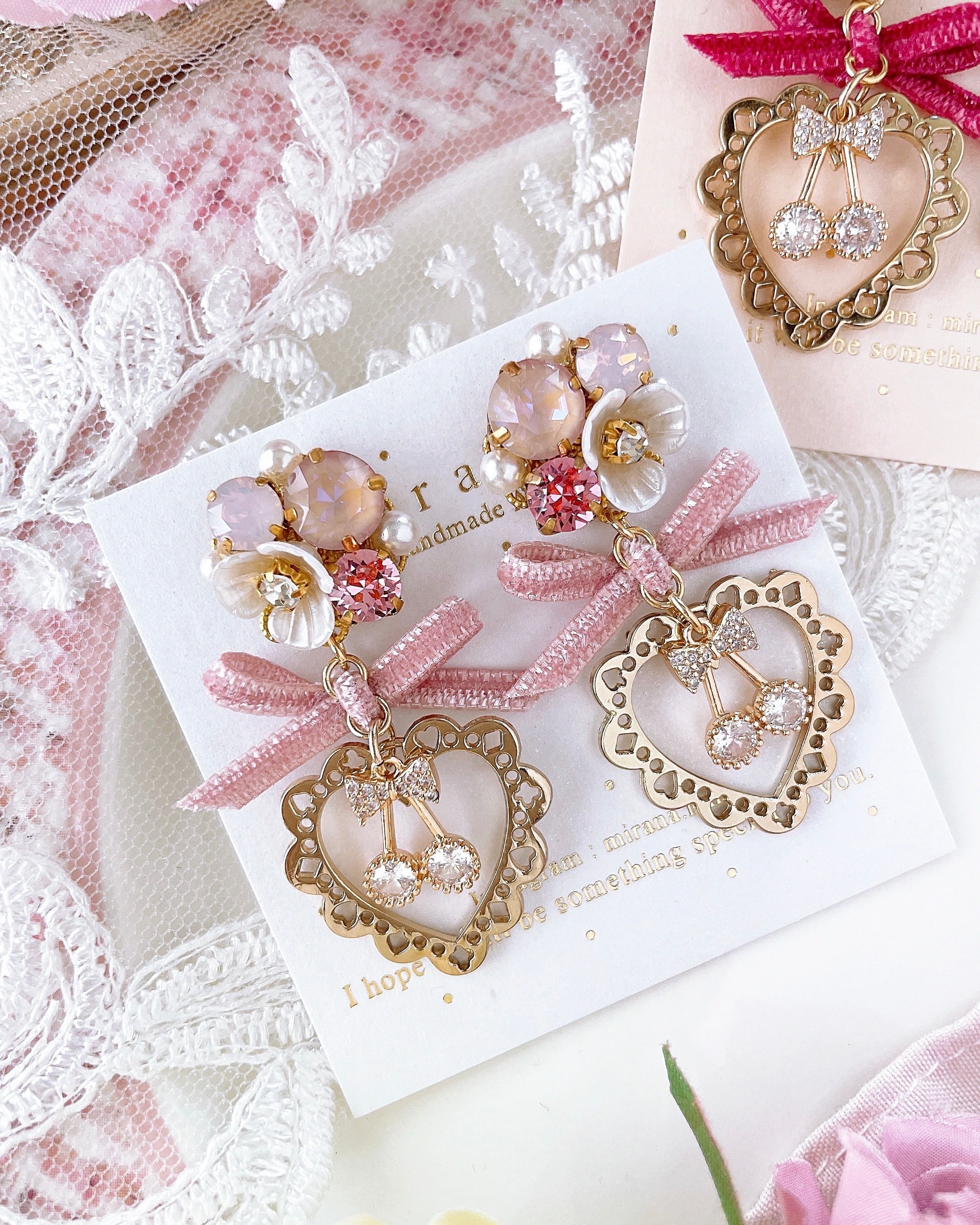 ベルベットリボンにレースのようなハートチャームとジルコニアのチェリーチャームを組み合わせたピアス/イヤリング。