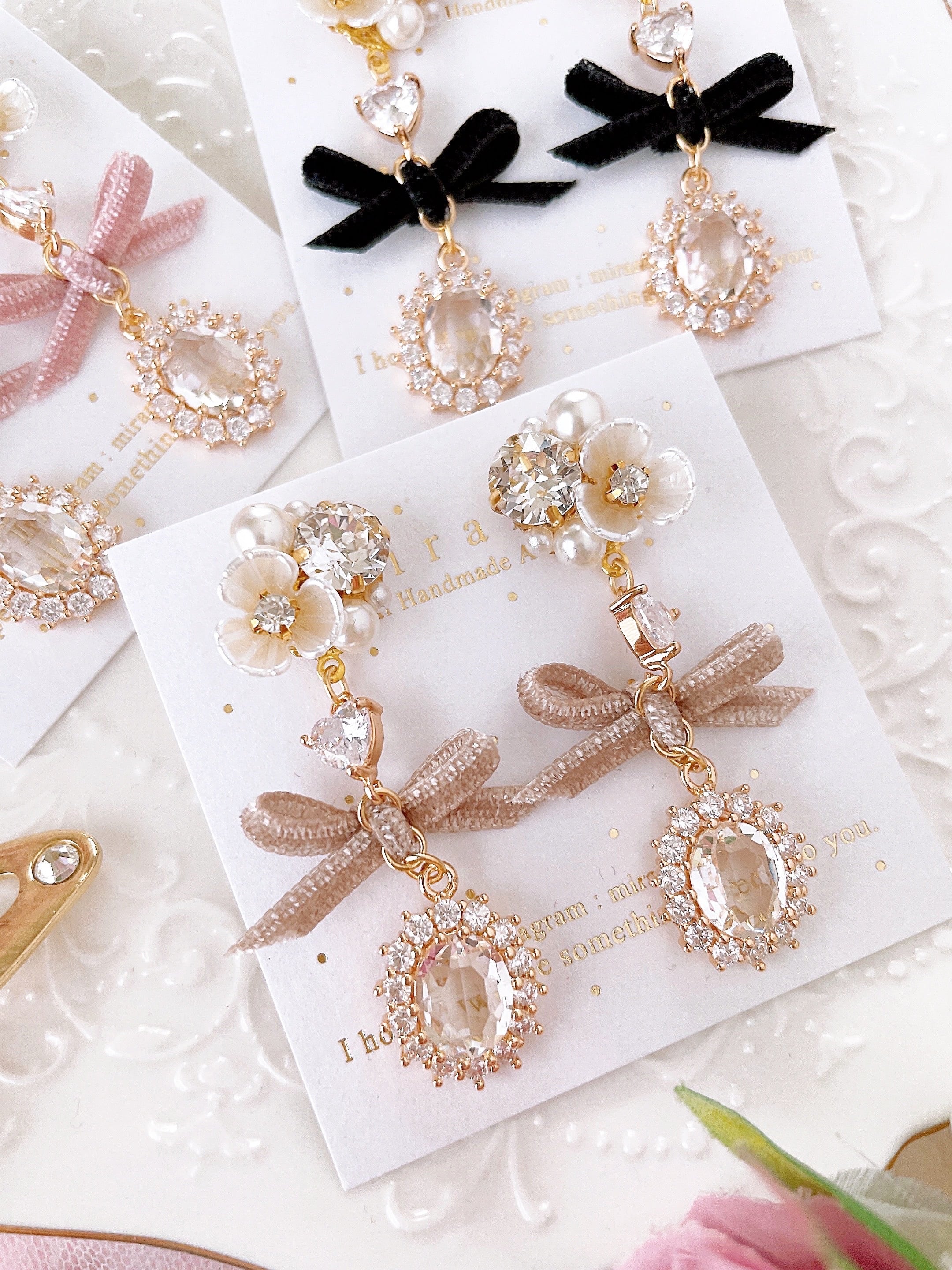 ベルベットリボンに、きらきらと揺れるビジューやジルコニアチャームを合わせた耳飾り。