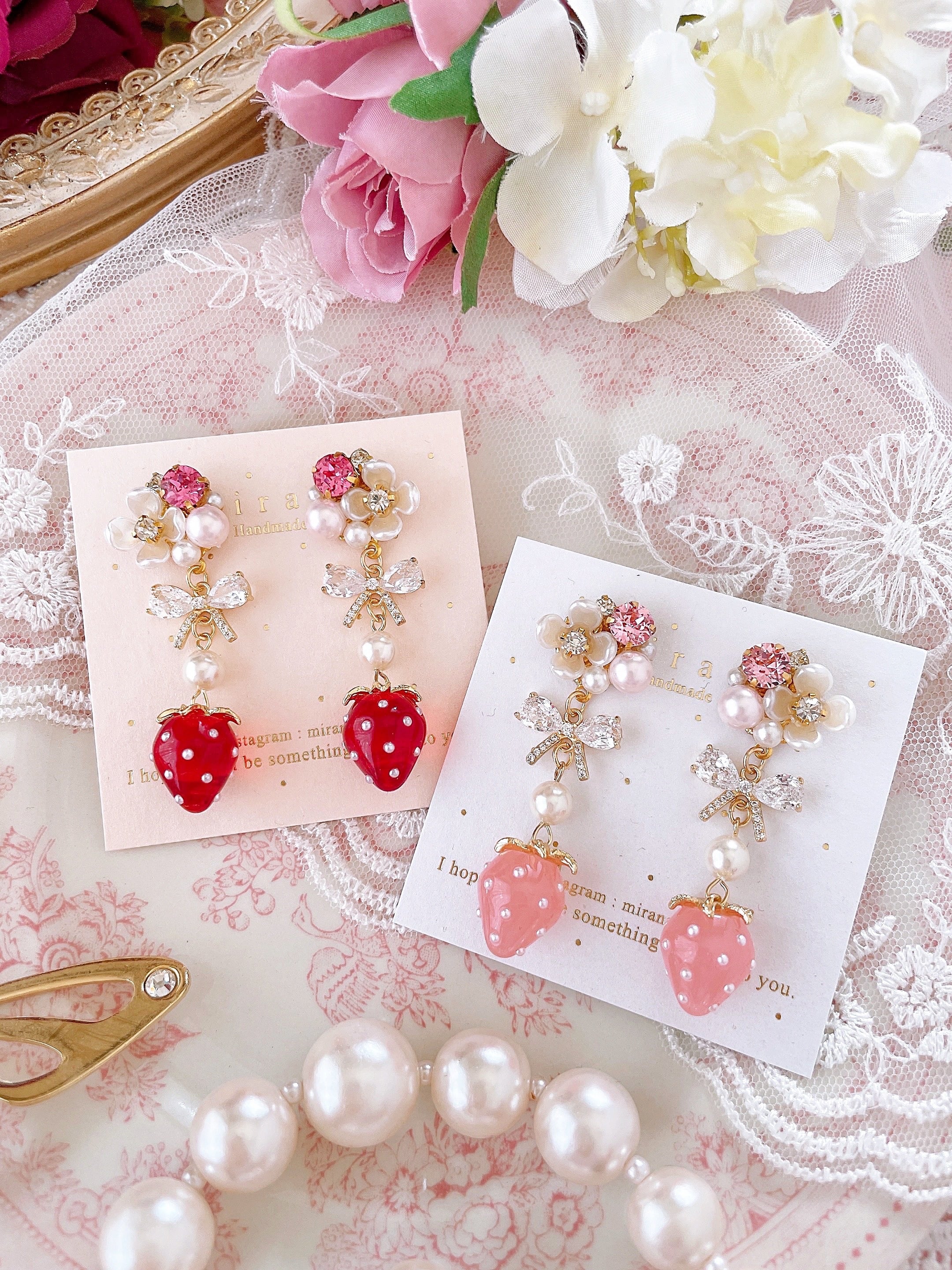 ホワイトフラワーとピンクパールのビジューに、苺チャームを合わせた耳飾り。