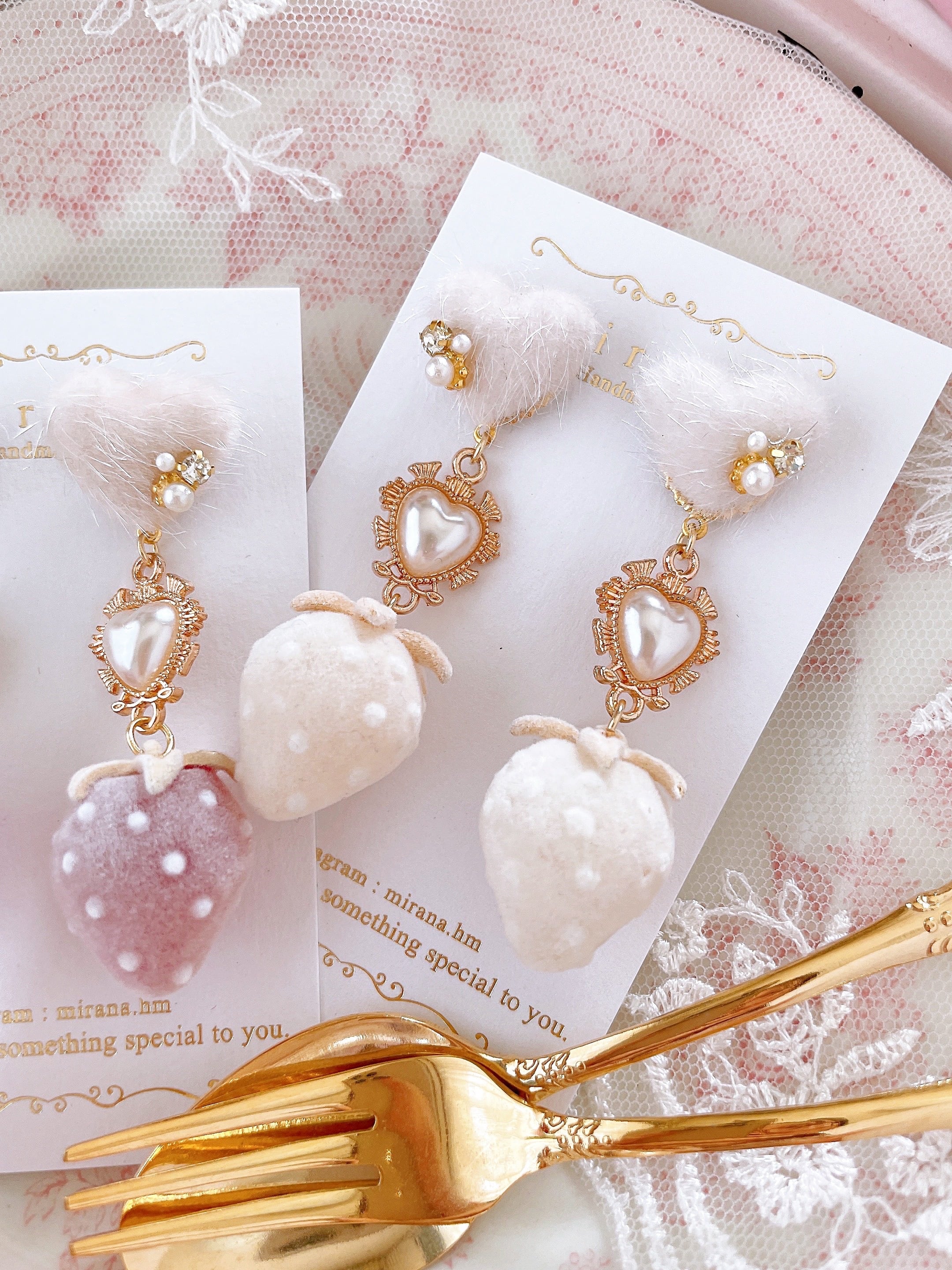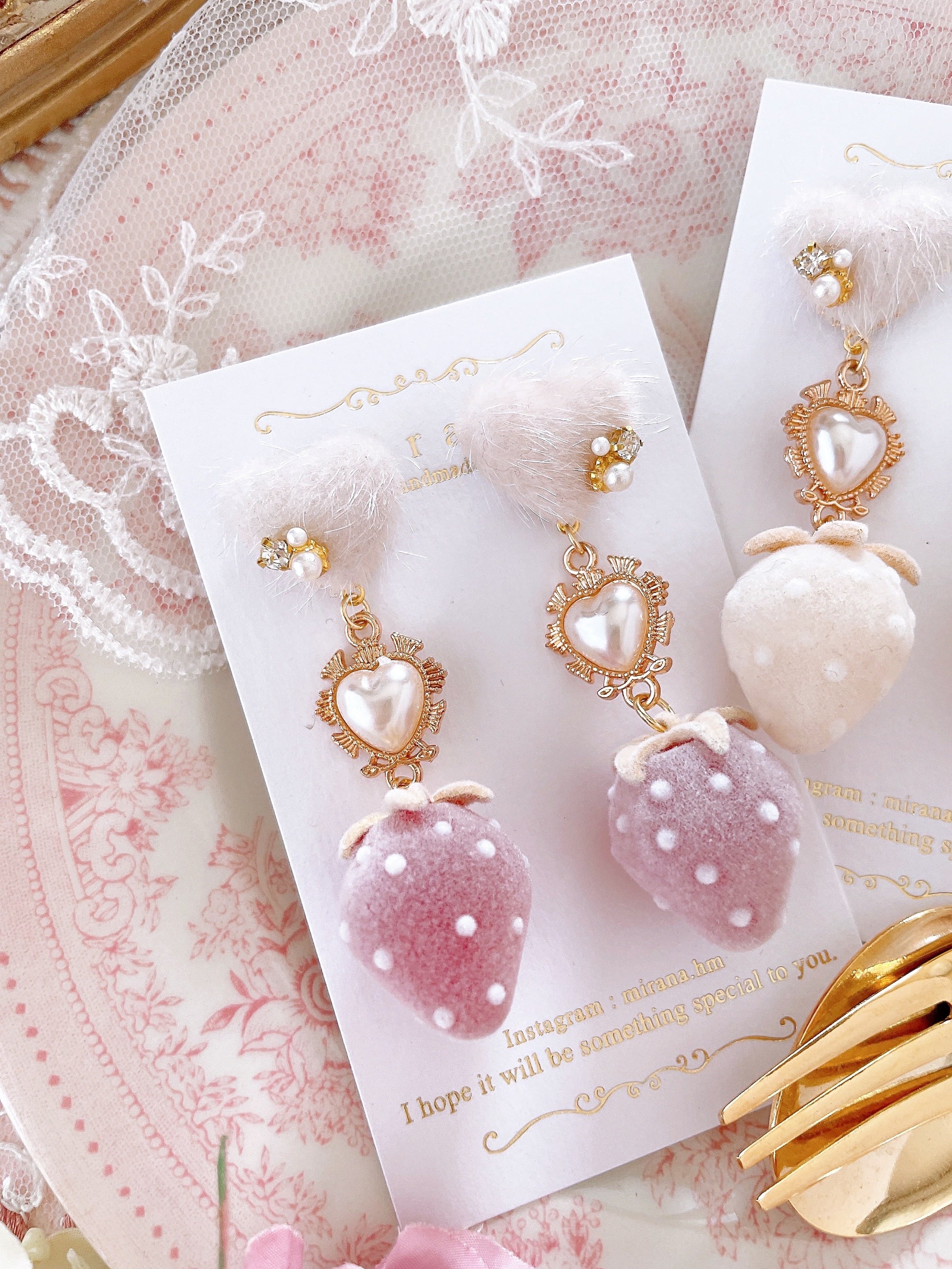 大人気デザインを少しリニューアルした、フロッキー加工の大きな苺が主役の耳飾り。